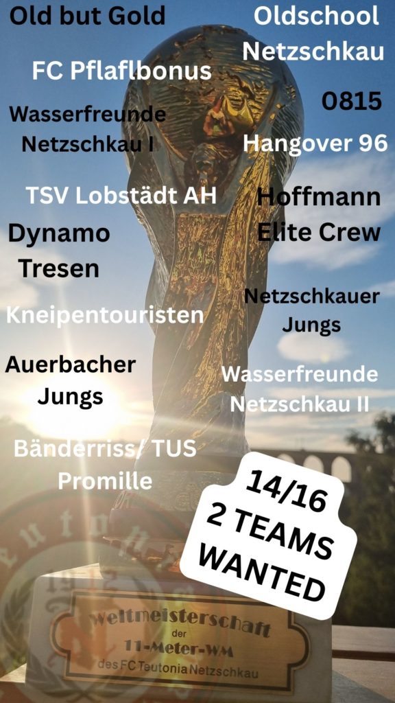 Oder holen sich Newcomer wie „Bänderriss/ TUS Promille“ aus Reichenbach den Pokal? Auch die Wasserfreunde aus Netzschkau haben auf dem Papier mathematisch gute Chancen, denn sie reisen direkt mit 2 Mannschaften an. Die weiteste Reise nehmen die Alten Herren des TSV Lobstädt auf sich, die allerdings nach der Elfer WM direkt ins Altherren Spiel gg Teutonia Netzschkau AH antreten werden und somit sicherlich ihre Kräfte schonen wollen. 16:00Uhr ist der geplante Anstoß.