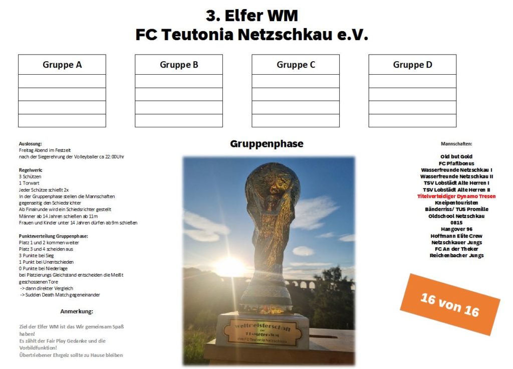 Nun seid aber erstmal IHR noch dran! Es werden noch 2 Mannschaften gesucht um die Elfer WM voll zu bekommen, also schnell noch anmelden, bevor die Plätze belegt sind.